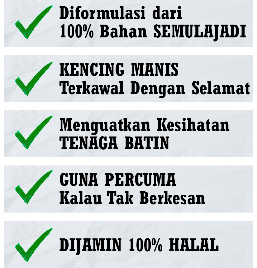 PENAFIAN: Keberkesanan produk ini bergantung kepada kesesuaian individu. Setiap hasil dari penggunaan adalah berbeza bagi setiap individu. Produk ini akan memberi kesan terbaik sekiranya pengguna mengamalkan dengan cara betul berdasarkan banyak testimoni yang diperolehi. Kita berikhtiar, tuhan yang menyembuhkan.